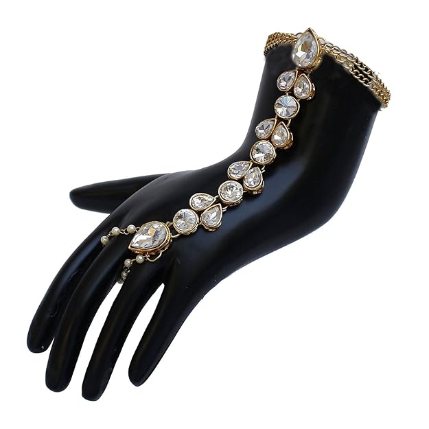 Crafted from high-quality metal with a rich gold-plated finish, it offers durability, comfort, and long-lasting shine. This hand jewellery pairs beautifully with bridal wear, sarees, lehengas, and festive outfits, making it an ideal accessory for weddings, festivals, parties, and special occasions.